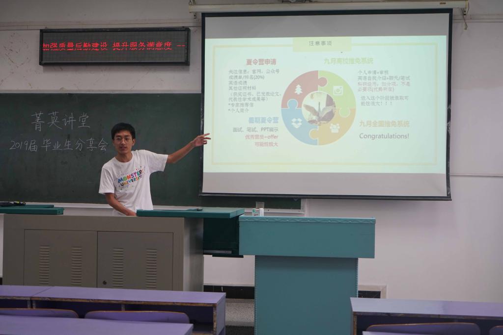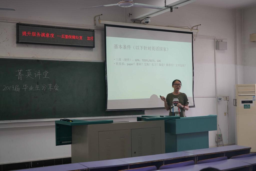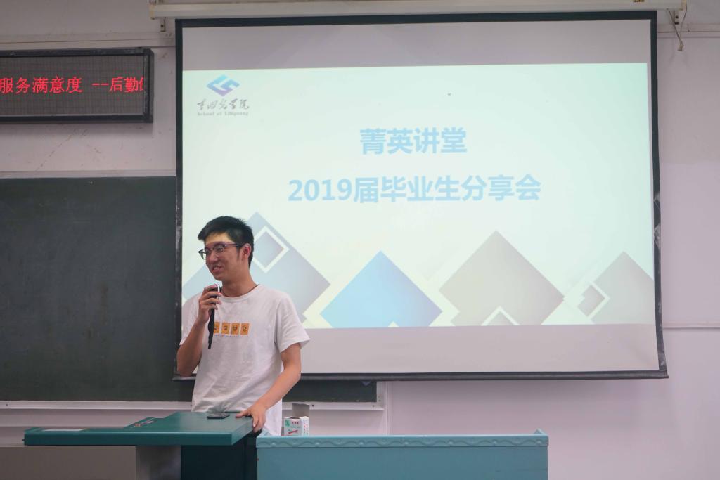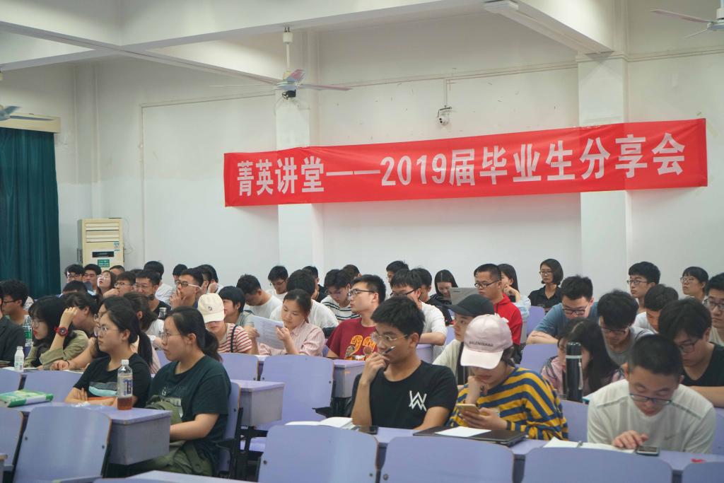 为充分发挥优秀毕业生的典型示范作用,进一步引导广大同学树立理想抱负,促进bat365官网学生全面发展。5月31日下午16:30,bat365官网菁英讲堂第三期暨2019届毕业生分享会在教三楼201举行。应邀出席分享会的共有8位即将毕业的优秀学长、学姐,她们各自在出国、保研、考研以及找工作的选择中找到了属于自己的出路,其经验分享为全院学生带来了一场关于未来选择的饕餮盛宴。分享会由bat365官网2019届毕委会主任刘禹成主持。