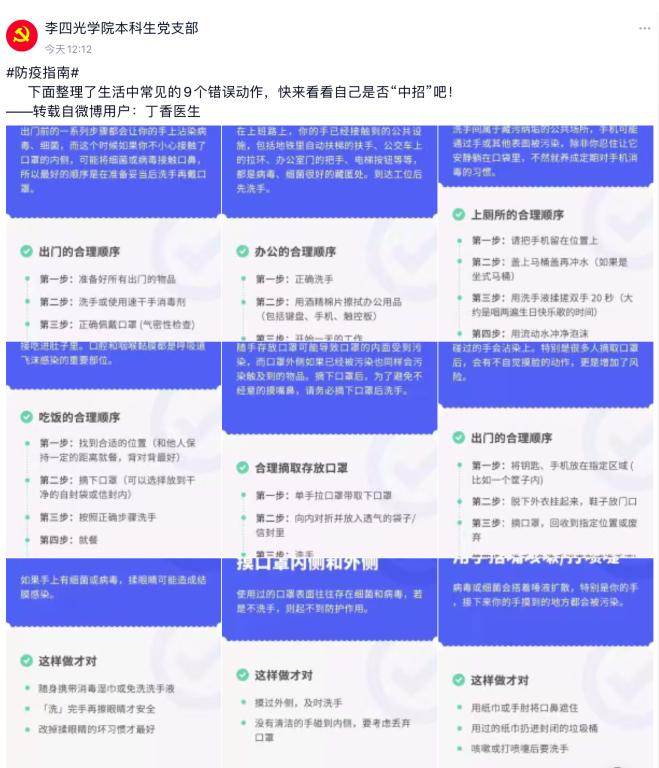 近期疫情防控形势依然严峻,党支部也依托QQ宣传平台开展了疫情防控宣传工作,确保分别在早中晚三个时间段开设的疫情日报、防疫指南、战疫先锋三个栏目,实时传递抗击疫情正能量。此外,支部成员在会上也提出了很多新的工作构想,接下来将会陆续开展,以党支部微薄之力为疫情防控阻击战加油鼓劲。