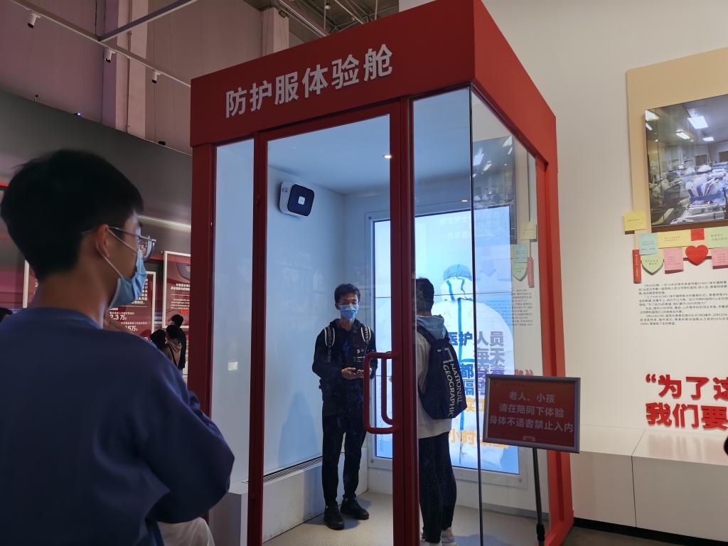 扫完健康码,老师和同学们有序排队入场。展馆内的一段段视频、一张张照片、一组组数据,无不诉说着一幕幕惊心动魄、气壮山河的“战疫”故事。实景重现,充分展现了中国式救援“火雷速度”,全国各地医疗队以及解放军战士逆行出征、支援武汉的无畏与勇敢。还有全息投影的ICU病房,原比例还原的方舱医院病房、防护服体验仓等,真实展现了白衣战士生死救援的关键时刻。沉浸式的参展体验,让大家不时驻足观看、感慨动容,看着展馆内的一件件展品,回想那段共克时艰的抗疫时光,不少老师和同学都忍不住流下了热泪。