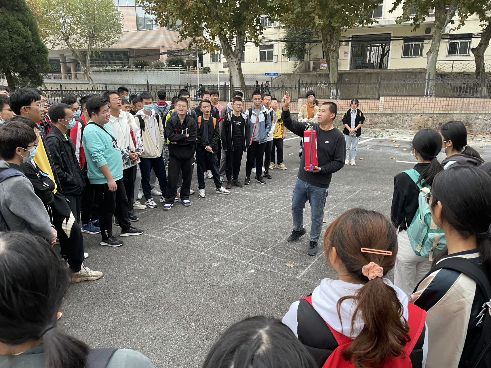图3.同学们在西区体育馆前进行灭火器实操演练