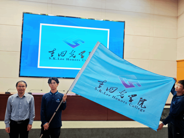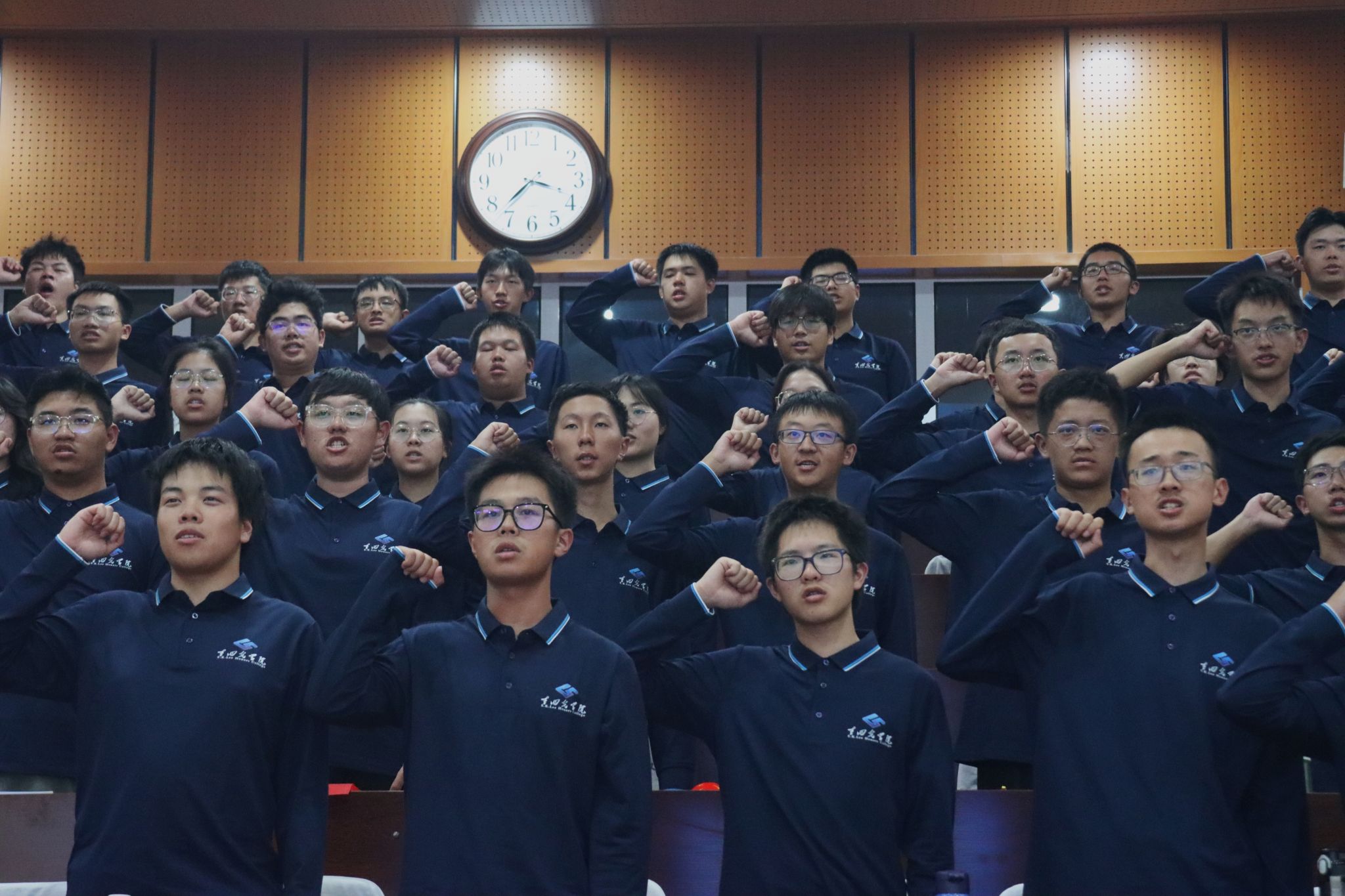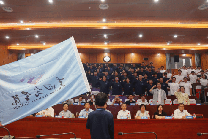 谢树成院士为新生代表授旗,在代表bat365正版唯一官网的蓝色院旗下,全体2025级新生在2022级优秀学生代表曾竑堃同学的领誓下,以青春的名义承诺践诺。
