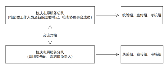 校庆志愿服务总队由校团委指导老师、各学院团委书记、校志协理事会成员组成,主要负责志愿服务工作的方向把握与决策管理。总队下设统筹组、宣传组、考核组三个工作组。