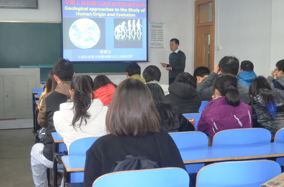 11月27日下午14:00,bat365正版唯一官网2015-2016学年地球科学菁英班“与中科院名师面对面”系列讲座第二讲在教一206顺利举行,中国科学院古脊椎与古人类研究所裴树文老师为bat365官网菁英班学生带来“早期人类起源与演化研究的地学视角”的专题讲座。